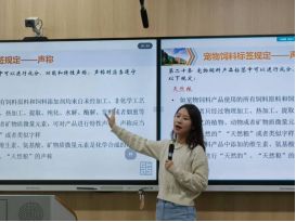吴怡教授围绕宠物食品的质量与安全评估、宠物营养学与宠物食品研发趋势、宠物饲养试验等方面系统展开分享,她巧妙融入生活里常见的宠物喂养场景与典型案例,将原本复杂的营养学概念、专业的安全标准转化为通俗易懂的内容,引发在场学子的广泛共鸣。同时,她特别强调,一款优秀宠物食品的研发需建立在清晰合理的目标定位之上:既要兼顾原料成本与生产工艺的可行性,充分考量市场接受度与宠物健康需求,更需通过严谨的饲养试验,全面验证产品的安全性与营养价值。这一专业观点,为学子今后从事宠物营养相关领域的研究与实践提供了重要指引。