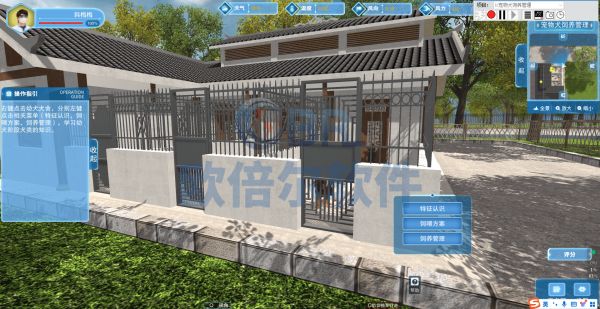 构建逼真的犬舍三维场景,支持第一人称视角自由漫游与镜头缩放(鼠标滚轮),提供身临其境的实训体验。