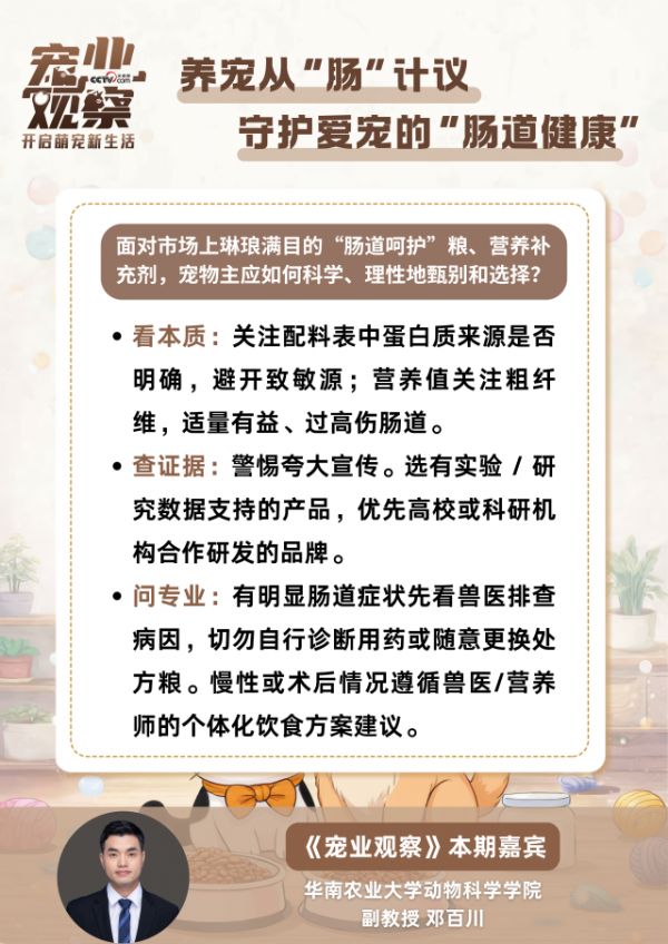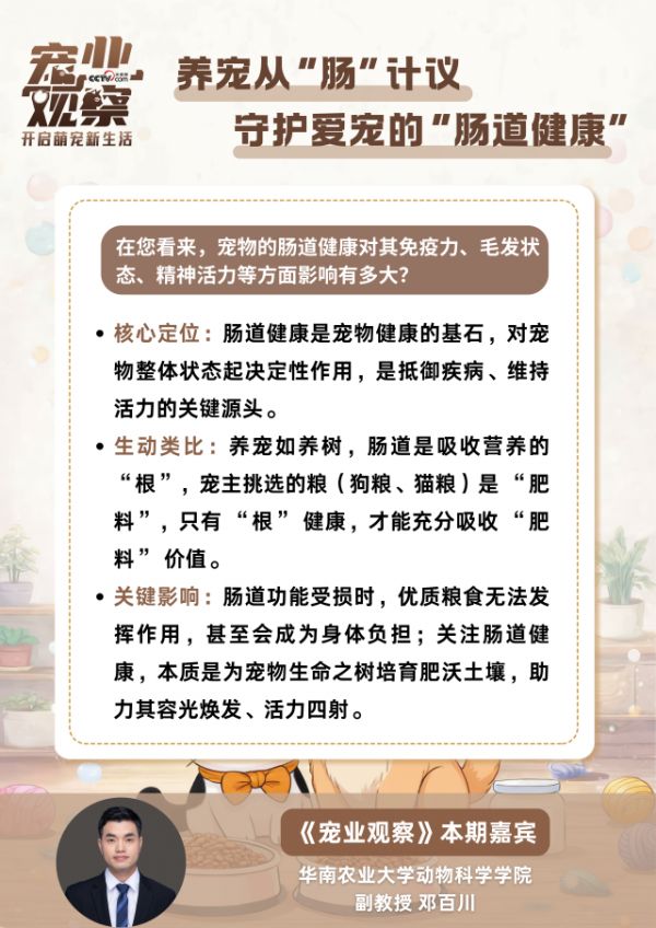 对话中,邓百川副教授聚焦宠物肠道健康问题,对科学养护的核心逻辑与实践方法进行解读: