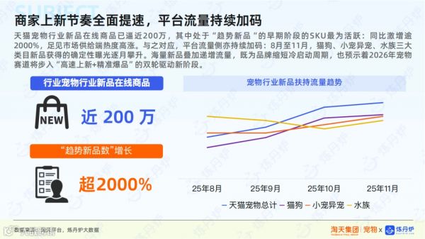 天猫宠物平台在线新品数已近200万,其中处于早期阶段(P0/P1)的趋势新品SKU同比激增超2000%,供给热度高涨。8—11月,猫狗、小宠异宠、水族三大类目新品确定性曝光逐月攀升。海量新品叠加递增流量,既缩短品牌冷启动周期,也预示2026年将进入“高速上新+精准爆品”双轮驱动新阶段。