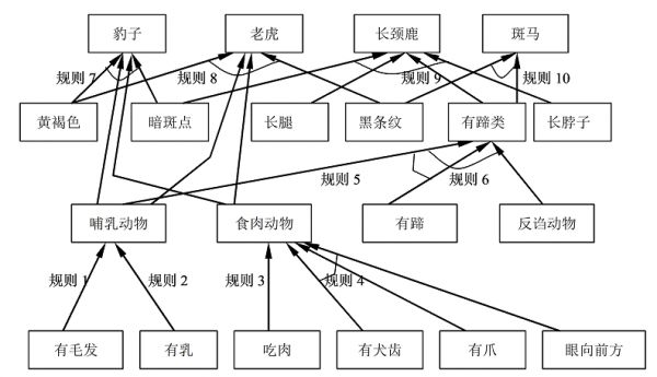 if 有毛发 then 哺乳动物 if 有乳 then 哺乳动物 if 吃肉 then 食肉动物 if 有犬齿 and 有爪 and 眼向前方 then 食肉动物 if 哺乳动物 and 有蹄 then 有蹄类 if 哺乳动物 and 反刍动物 then 有蹄类 if 哺乳动物 and 食肉动物 and 黄褐色 and 暗斑点 then 豹子 if 哺乳动物 and 食肉动物 and 黄褐色 and 黑条纹 then 老虎 if 有蹄类 and 长脖子 and 长腿 and 暗斑点 then 长颈鹿 if 有蹄类 and 黑条纹 then 斑马