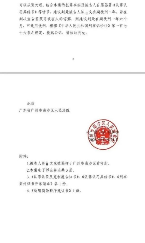 2025年10月9日,陈某文因涉嫌故意毁坏财物罪被广州市公安局南沙分局刑事拘留。2025年10月23日经南沙区人民检察院批准逮捕,同日被广州市公安局南沙分局逮捕。