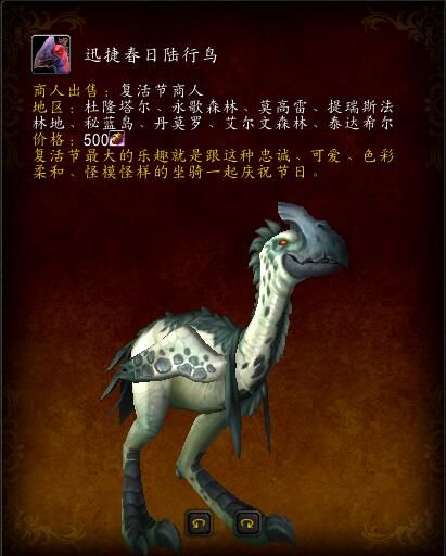 迅捷春日陆行鸟:坐骑,售价500巧克力,很丑,且可以交易: