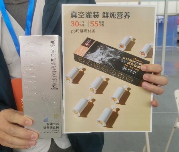 当日上午,大皖新闻记者来到滨湖国际会展中心2号馆,在宠物用品专区,一款智能猫条喂食器格外引人注目。据该品牌展位工作人员介绍,这款猫条喂食器是该企业的自研产品,倡导人与猫咪的友好互动,目前主要应用在撸猫馆、猫舍和一些人宠友好景区。“这款产品倡导人与猫咪之间的友好互动,机器可以在喂食的同时,将喂食数据实时上传到我们的小程序上,再通过AI算法把数据反馈给主人,做到喂食数量的提醒以及宠物健康生命周期的监测。”工作人员拿出一支喂食器向记者展示,一颗咖啡胶囊样式的猫条被安装到录音笔大小的机器中,按下按钮,猫条便从机器前端的小孔中挤出。“这款产品还能够防止喂食者与猫咪直接接触,猫咪对其产生应激反应而导致的误伤。”工作人员解释道。