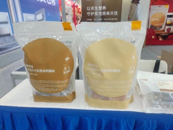 在旁边的品牌展位,多款宠物零食陈列其中,专为宠物准备的新春礼盒也已上架亮相。“我们主要是做宠物零食的,主打天生简单的理念。”该展位工作人员指着一款名为“一大包风干的整块鸭胸肉”的零食告诉记者:“像我们这种包装,它的名字就是它的配料表,没有任何添加剂,它的原料很简单,只有包装上写的那一个。”