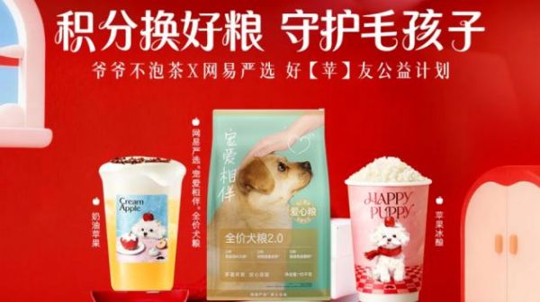 2025年岁末,爷爷不泡茶携手网易严选发起公益宠物粮捐赠计划,为流浪毛孩准备了一份特别的“年夜饭”。活动期间,消费者每用10个会员积分就能兑换1份狗粮,所有募集的宠粮将于2026年2月统一捐赠给爱护动物保护中心。