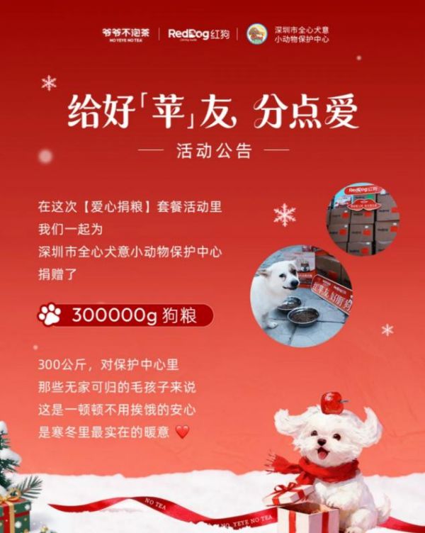 爷爷不泡茶在公益模式上展现出创新思维,将简单的茶饮消费转化为可持续的公益行动。品牌与红狗合作,在华南地区推出“爱心捐粮”套餐,消费者每购买一份指定套餐,红狗即向深圳市全心犬意小动物保护中心捐赠10g公益粮。