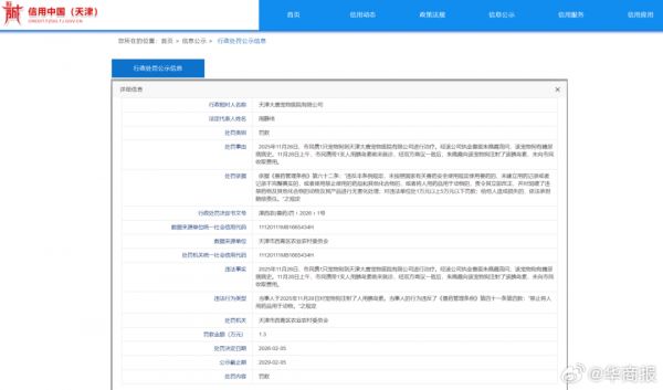 信用中国网站援引天津市西青区农业农村委员会数据来源显示,因免费给宠物狗注射1支人用胰岛素,2月5日,天津市西青区农业农村委员会对天津大唐宠物医院有限公司进行处罚,罚款1.3万元。