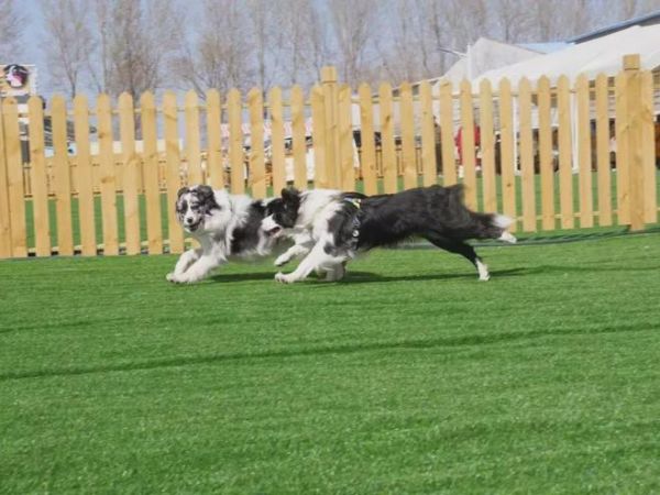图为宠物狗在寄养机构的户外空间奔跑嬉戏。
