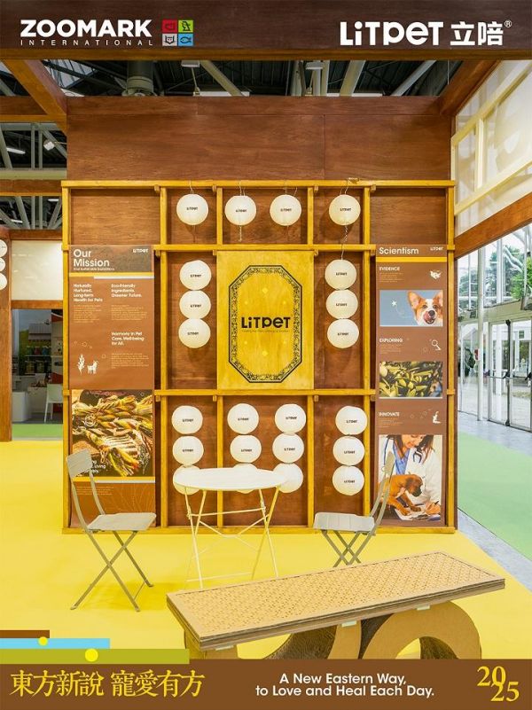 LitPet立陪展馆坐落于 ZOOMARK“国际会馆”核心区域(25馆 A102-B103),展区面积达80平方米,以东方中药堂美学为灵感,呈现本次主题:
