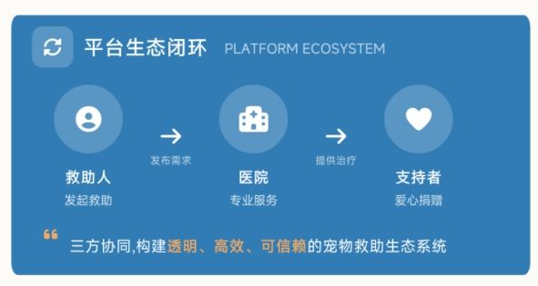 该项目的核心创新在于其构建的“救助人-医院-支持者”三方协同的生态闭环。平台严格遵循“三大透明原则”:救助信息全程可追溯、资金流向实时公示、救助流程标准化记录,从而有效解决了传统救助模式中信息不透明、资金监管缺失等痛点。此外,平台深度聚焦宠物医疗垂直领域,凭借对行业需求的深刻理解,提供了从发起救助、医疗对接到社会筹款的全流程数字化解决方案,显著提升了救助效率与公众参与度。