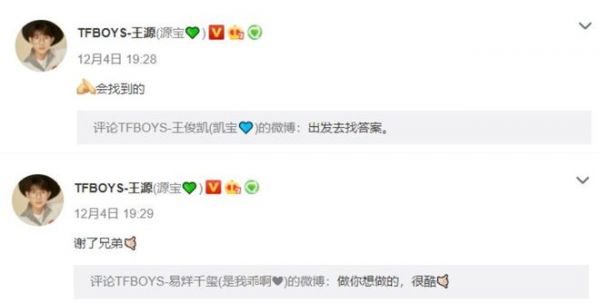 TFBOYS他们仨有自己的群,他们也会在群里经常吐槽一下自己的工作很忙很累,他们也会有好玩的东西往群里分享,也会经常斗表情包。跟很多这个年纪的青年一样,他们只不过是多了一层艺人的身份罢了。王源首发新歌《我不知道》,王俊凯评论:出发去找答案。易烊千玺评论:做你想做的,很酷。粉丝在猜测王源到底有没有参加伯克利的面试,人家三人直接送上了对未来的祝福,勇敢做自己,出发找答案!我想这就是最好的情谊,考大学这件事情很重要,王俊凯和千玺作为过来人肯定会为王源提建议,但他们除了体检以外,还很尊重王源的决定。