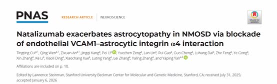 近日,我院闫亚平教授团队在PNAS上发表一项突破性研究成果,首次揭示多发性硬化症(MS)治疗药物那他珠单抗(Natalizumab)加重视神经脊髓炎谱系疾病(NMOSD)的分子机制,为这一罕见且凶险的自身免疫病带来了全新的治疗靶点和策略。该研究题为“Natalizumab exacerbates astrocytopathy in NMOSD via blockade of endothelial VCAM1–astrocytic integrin α4 interaction”,不仅澄清了多年来困扰临床医生的“MS有效药为何加重NMOSD”的悖论,也为靶向星形胶质细胞的精准治疗奠定了关键实验基础。