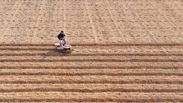 2月13日,在山东省枣庄市山亭区桑村镇,农民驾驶农机开沟准备播种马铃薯(无人机照片)。近日,随着气温回升,山东省枣庄市山亭区农民积极开展春耕备耕,一派人勤春早的忙碌景象。