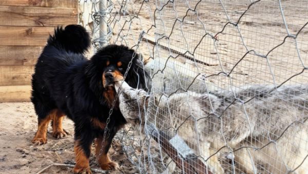 内蒙古两狼隔着铁丝网与藏獒热情贴贴,生死冤家为何化敌为友?