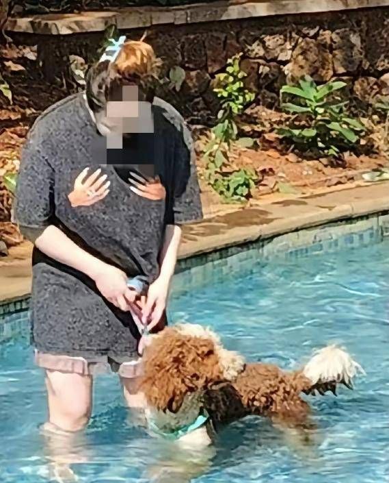 正当孩子们玩得高兴时,转头一看,一名身穿灰色衣服的女子,她牵着狗狗直接站在游泳池里。