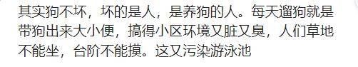 有网友表示坏的不是狗,而是人:其实狗不坏,坏的是人,是养狗的人。每天遛狗就是带狗出来大小便,搞得小区环境又脏又臭,人们草地不能坐,台阶不能摸。这又污染游泳池。