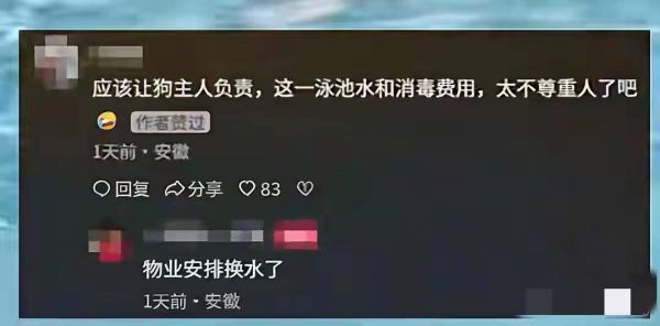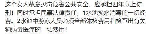 还有网友建议让狗主人赔偿:这个女人故意投毒危害公共安全,应承担四年以上徒刑!同时承担民事法律责任,1水池换水消毒的一切经费。2水池中游泳人员必须全部体检费用和检查出有关狗病毒医疗的一切费用!
