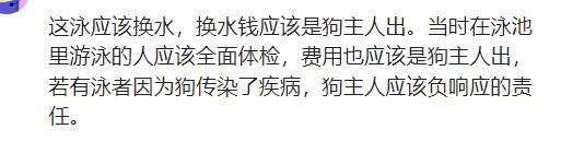 有网友认为应该追究狗主人的法律责任:这泳应该换水,换水钱应该是狗主人出。当时在泳池里游泳的人应该全面体检,费用也应该是狗主人出,若游泳者因为狗传染了疾病,狗主人应该负响应的责任。