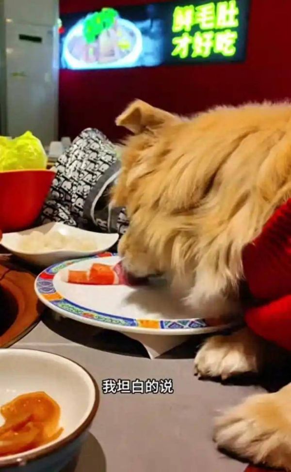 该爱狗人士,让狗狗趴在桌子上,用嘴舔着面前的一盘羊肉卷,狗狗吃得很香,还将整个盘子都舔了一遍。