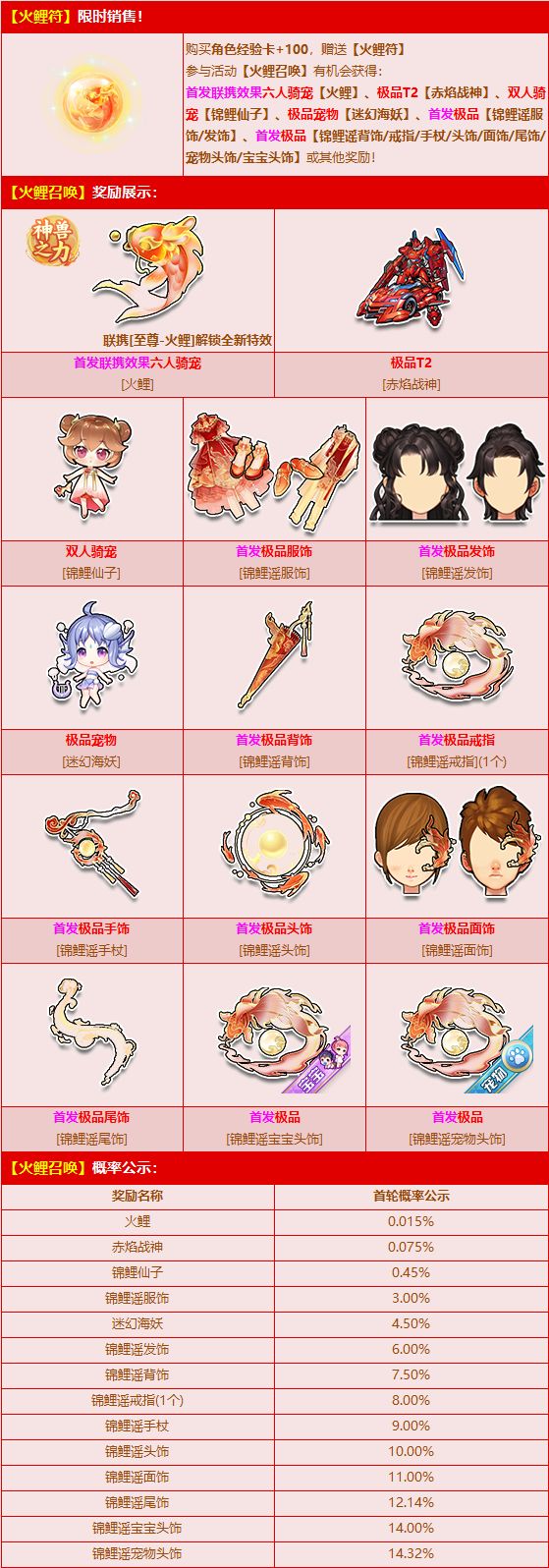 (1)首发特惠礼包:【火鲤符】单笔100个限时五折,活动期间限购1次!