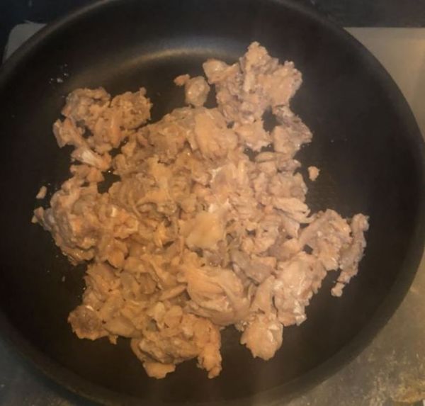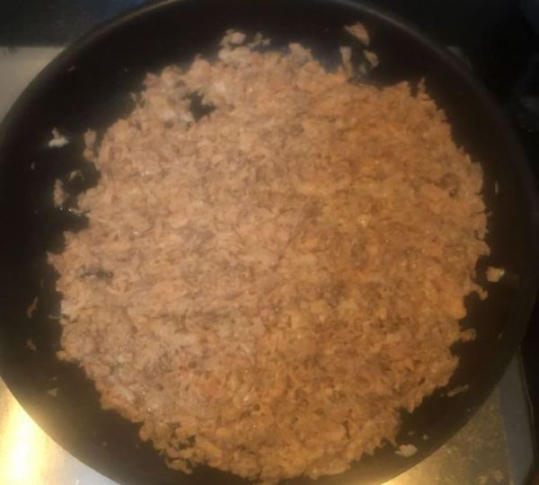 将煮好的三文鱼导倒入平底锅中,注意要稍微沥干水分,不然会炒的手酸(不要问我怎么知道的。因为这是血泪眼睛)。