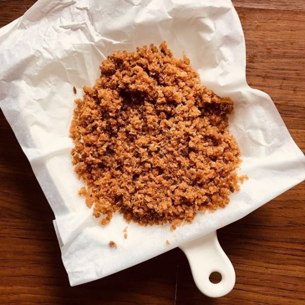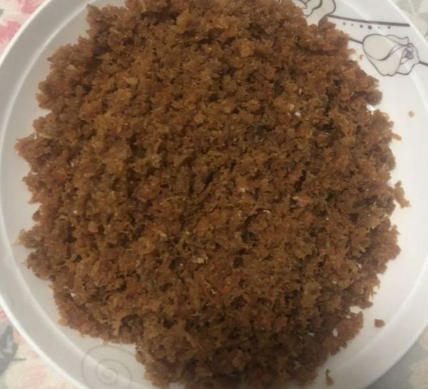 经过长达20分钟的不同翻炒。初版肉松出锅,这是肉松还是比较大块,需要擀面杖的帮忙,如果家里有料理机就更好了。