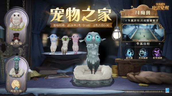 可爱的变形兔从魔术礼帽中探出脑袋,爪子轻轻搭在帽檐上;一旁的月痴兽围绕月亮小球,踏着欢快的舞步。小雪鸮细心整理着宠物小窝的软垫,邀请巫师们一同查看「宠物之家」活动的最新情报!全新「宠物之家」活动即将开启,限时上架四款特惠礼包,为爱宠安家添份实惠!