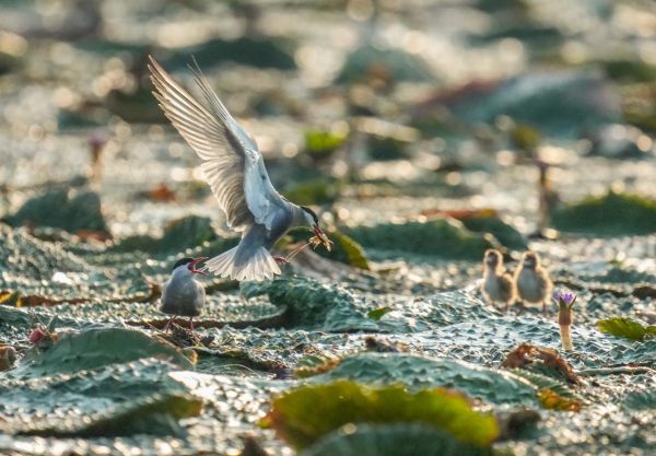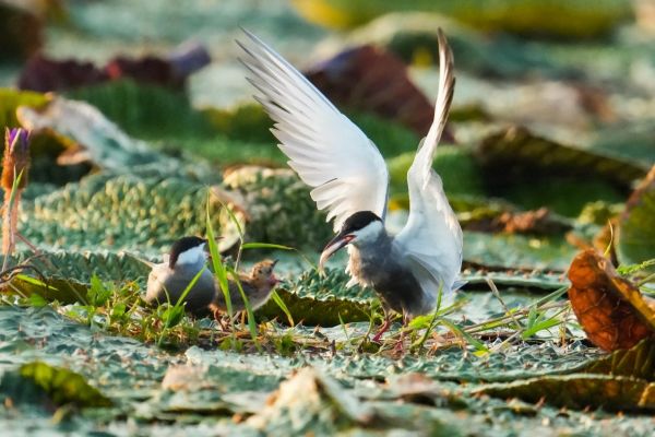 我们乘坐小船,来到池塘中的观鸟棚,只见一窝窝的须浮鸥雏鸟集中在此,须浮鸥大多以雌雄配对的形式抚育2只雏鸟。在金色的朝阳下,雄鸟不停地往返于巢穴与觅食地之间。每寻到一条小鱼,它便迅速叼回鸟巢。此时,巢中的母鸟和雏鸟早已仰头望向天空,急切地等待着雄鸟的归来。当发现雄鸟的身影,它们便激动地仰起脖颈,张大嘴巴,盼着投喂。大自然的生存环境充满挑战,并非每只外出的须浮鸥都能很快找到鱼虾,也不是每只小鸟都能等到精准投喂。我们观察到,一窝雏鸟的体型存在差异。当一只大鸟叼鱼归来时,体型较大的雏鸟迅速挤上前去争抢食物,而体型较小的雏鸟则急得"哇哇"直叫。大鸟在半空反复盘旋,眼神中透着焦急,试图绕开争抢的小鸟,将食物送到体型较小的雏鸟嘴边。然而,尝试几次后,体型小的雏鸟始终挤不到前面,最终,大鸟只得将小鱼喂给了体型大的雏鸟。还有一次,当鸟爸爸外出觅食时,鸟妈妈在巢中守护着两只雏鸟。雄鸟叼鱼归来想投喂给小鸟,鸟妈妈却一直围着雄鸟转,想要抢先吃到这一天的早餐。鸟爸爸反复避让,可鸟妈妈紧追不舍,最终,鸟爸爸无奈之下,只得任由鸟妈妈将食物抢去,而巢中的两只雏鸟则饿得"嗷嗷"直叫。大自然的生存法则便是如此,优胜劣汰,但无论雄鸟、雌鸟还是雏鸟,都在为生存而努力,为成长而拼搏。