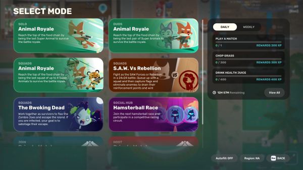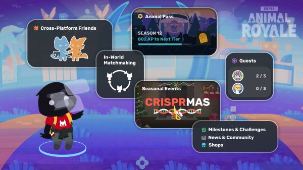 我们称这个新循环为超级生命循环。你可以探索新的社交中心,与角色聊天,接受任务,然后直接匹配进入《Super Animal Royale》或其他竞技模式。当你阵亡(或跳起胜利之舞)后,你会重生回到中心重整旗鼓,领取奖励,再次出发迎接下一场战斗。