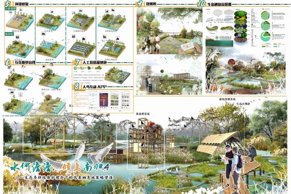 本方案由候鸟出发,提出一系列设计理念及策略,旨在恢复湿地生态环境,保护候鸟栖息地。首先,对保护区进行生态功能分区,对区内湿地进行生态修复,其次,从人鸟共生的角度出发,建立缓冲带,隔离声音和光污染;营造多个候鸟栖息岛,对候鸟进行合理的人工干预;最后,通过修建科普园和一些科技手段(VR眼镜、APP扫描等)可以向游客科普候鸟知识,提高大众保护候鸟的意识。