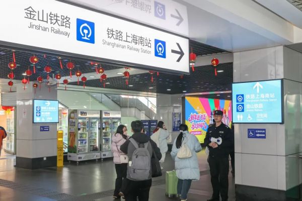铁路上海南站相关数据显示,当日车站预计发送旅客96000余人次,开行列车144班,同时增开多趟临客列车提升运输能力。上午9时,车站北广场已是人头攒动,拖着行李箱、提着年货的旅客步履匆匆,滚轮声与广播引导声交织,勾勒出春运独有的烟火气息。为应对激增客流,南站管委办提前部署,在车站出入口、换乘通道等关键点位循环播放进站须知、检票指引等广播内容,有效避免人流拥堵。南站治安派出所组建的“春运青年突击队”也活跃在站区各处,青年民警、辅警高效处置寻人寻物、证件遗失等高频求助。