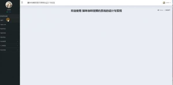 管理员进入主页面,主要功能包括对用户、咖啡分类、咖啡商品、猫咪信息、猫咪预约、系统管理、订单管理、我的信息等进行操作。管理员主页面如图5-7示: