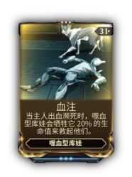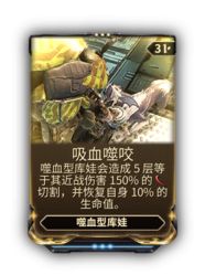 可能出现的bug:被感染的视觉效果即使被获取了基因模版也无法移除。 守护 模块化 恐鸟 • 猎犬 库狛 库娃 库娃 种类 驯化 镜像型库娃 • 噬血型库娃 • 笑面型库娃 独特 薇娜丽 敌人 库娃(野生) • 鬣猫 繁殖 库娃遗传密码 • 孵化器能量核心 外观 库娃外观 基因 DNA稳定剂套装 • 基因密码模板 • 噬血型库娃初心者套装 MOD Penjaga 镜像型 猫眼 • 反射 笑面型 招福 • 顽皮 噬血型 血注 • 吸血噬咬 其他 取回 • 搜集 • 恐惧感知 • 侵略领土 架势 刺杀姿势 • 稳定姿势 • 诡秘姿势 • 狂暴姿势 • 坚韧姿势 • 护卫姿势 Madurai 同伴 星界连结 • 双影连结 • 火焰腺体 • 冰冻双颚 • 猎人命令 • 猎人复元 • 重大连结 • 领袖 (Prime) • 猛扑 • 磨锋之爪 • 震撼连结 • 串联连结 • 凶恶连结 • 技法猛袭 • 技法强化 利爪 咬碎 • 嗜血 • 蛮力调控 • 灼热之爪 • 寒冰之爪 • 传染连结 • 优胜劣汰 • 伤残调控 • 猎人协力 • 免疫抵御 • 磁力打击 • 捶击 • 机甲超载 • 精准调控 • 脓毒之爪 • 电击之爪 • 电击项圈 • 挥击 • 牙齿毒液 Vazarin 链接纤维 • 链接生命力 • 链接蓄能 • 忠实搭档 • 宠物治疗套件 • 庇护 Naramon 同伴 动物本能 (Prime) • 隐蔽连结 • 神秘连结 • 强固连结 利爪 击钟者es:Kavat Vasca