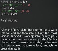 库狛经常被比作狗,但也有类似熊(他们的爪子)和蝙蝠(他们的耳朵)和蜜蜂/黄蜂(他们严酷的防御行为)的特征 野性Kubrows的蹲伏姿势明显低于驯养的Kubrows,可以解释为更具攻击性/防御性的肢体语言。 有时可以看到它们在尚未具有敌对意识的情况下站得更直。 库狛在 Codex 显示没有它们的发光的红眼. 它们的眼睛发光仅仅当具有敌对意识。 在氏族道场的Orokin实验室中可以看到一个巨大的白色库狛。 这应该是库狛的预告片. 截至于 更新 15.7 野生库狛不在掉落奥席金属.影音资料