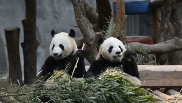 大熊猫姐妹并肩吃竹子,悠闲又自在