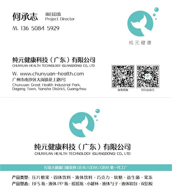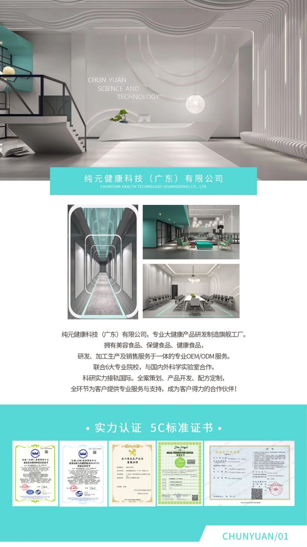 纯元健康集团:功能性食品、保健品、特殊营养膳食OEM/ODM代工工厂。主体20000㎡(南沙)厂区及80000㎡(肇庆)厂区组成。是世界の生命科学研究センター、SUGAR INTAKE SUBSTITUTE LAB™代糖实验室、国内外多个高等学府科研转化基地。纯元以甲方角度对市场进行深度剖析解读:“从营销角度,推陈出新,产品迭代与爆品研究,打造适合甲方专属渠道,剂型表达方式,以及内容物,完善甲方产品架构,提升市场占有率”。产品开发及生产覆盖肠道健康、体重管理、口服美容、滋补类、私密类、蓝帽子保健品、特膳(运动营养)等口服大健康领域,囊括代餐、酵素、胶原蛋白、维生素、全骨营养片、左旋肉碱等细分品类,全面架设植物提取、无菌灌装BFS、PP瓶、玻璃瓶、片剂、粉剂、益生菌、巧克力、亚麻籽球等各种不同产线。并通过多家知名品牌审厂与深度赋能合作及基于大健康产品的庞大市场需求与行业功能性食品科研日新月异的蓬勃发展,为加强建设客户品牌的产品创新力,围绕【重研发】战略,纯元集团化部署公司构架、投产40+亩大健康科技产业园区、跨国共建联合实验室、全球机构合作新原料投产应用,坚守产品守正出奇的出品精神。