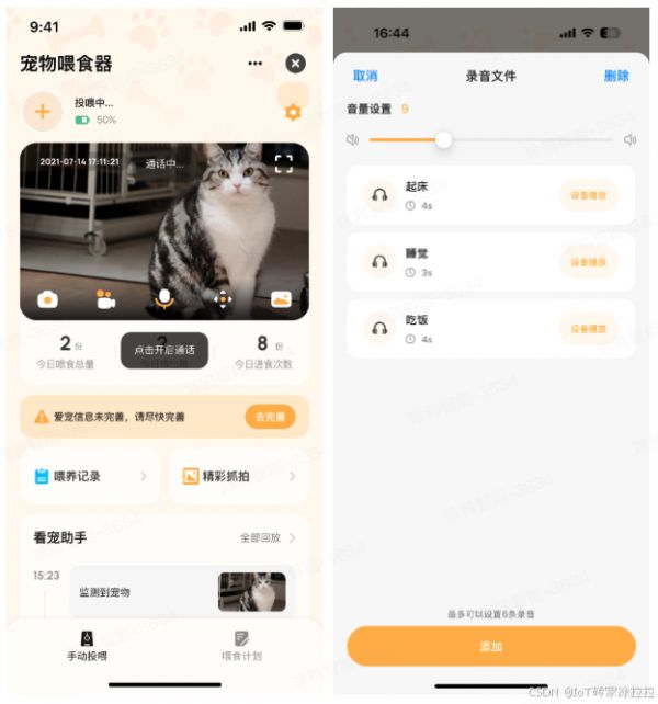 设计智能语音交互系统,支持用户录制并播放特定场景音频或直接进行音视频双向对讲的形式,安抚宠物、寻找宠物或进行趣味互动: