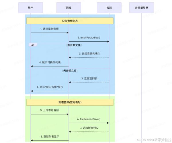 音频上传云存主要包含以下步骤:获取临时地址上传签名、上传音频文件、获取上传状态、轮询大文件上传状态、保存宠物媒体文件