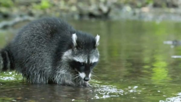 浣熊吃小龙虾 在这片溪流,浣熊以龙虾为生,小龙虾生存在缝隙中