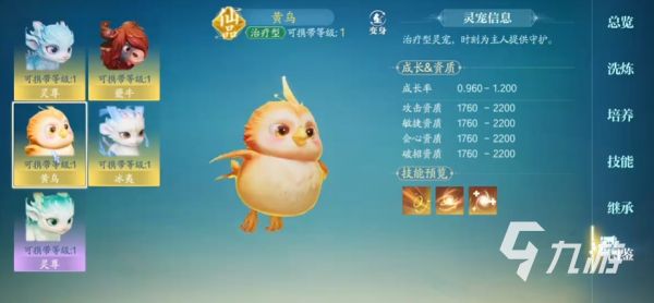 黄鸟也是很多小伙伴会选择的宠物,它的核心技能能够提升10%的防御冷却时间只有15秒,虽然黄鸟和灵尊都是辅助类型的宠物,但其实黄鸟的搭配率会更高一点,适合多个职业使用,因为无论是哪个职业,多点防御力总是好的,所以如果前期小伙伴们不是很熟练的时候,建议搭配这个宠物,给自己的战斗提升容错率。
