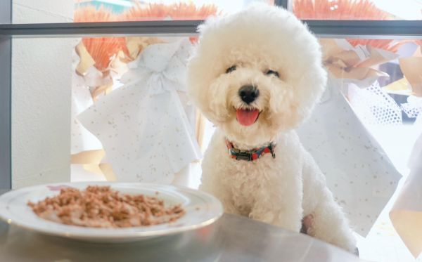 一只两岁多的比熊犬“棉花糖”正坐在专属座位上“大快朵颐”,用餐完和小伙伴们一起愉快地玩耍。一旁“棉花糖”的家长与店员交流养宠知识,咨询宠物食品配方。