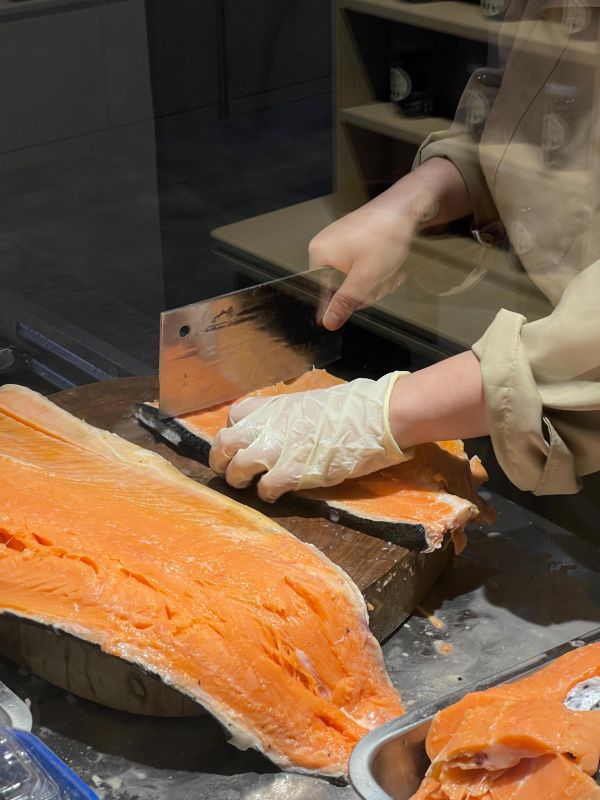 “宠小鲜”透明厨房里,工作人员正在处理新到货的三文鱼。受访者供图