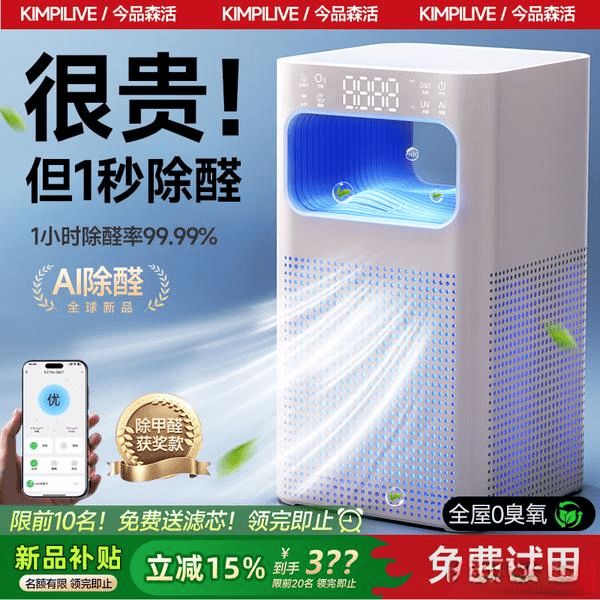 今品森活空气净化器采用AI引擎捕捉技术,能够针对超大空间的甲醛污染,双涡轮增压风口形成强大的净化涡流,深度除醛。