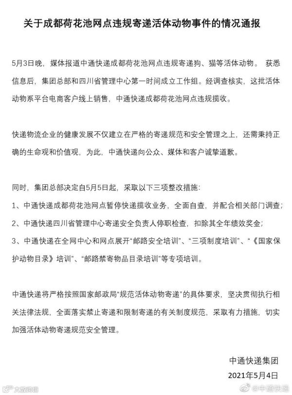 5月4日深夜,中通快递发布关于成都荷花池网点违规寄递活体动物事件的情况通报,为相关网店违规揽收致歉,表示该站点会暂停业务配合调查,同时中通快递四川省管理中心相关负责人接受停职调查。