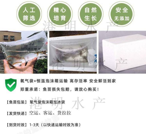(1)淡水鱼苗全程呵护:全部淡水鱼苗内包装使用双层氧气袋,确保无破损、漏气情况,可长期运输达12-24小时,鱼苗损耗在1%-5%以下;外包装采用厚纸箱内含防震泡沫箱,破损率在0.5%以下,批发淡水鱼苗的客户可放心购买。