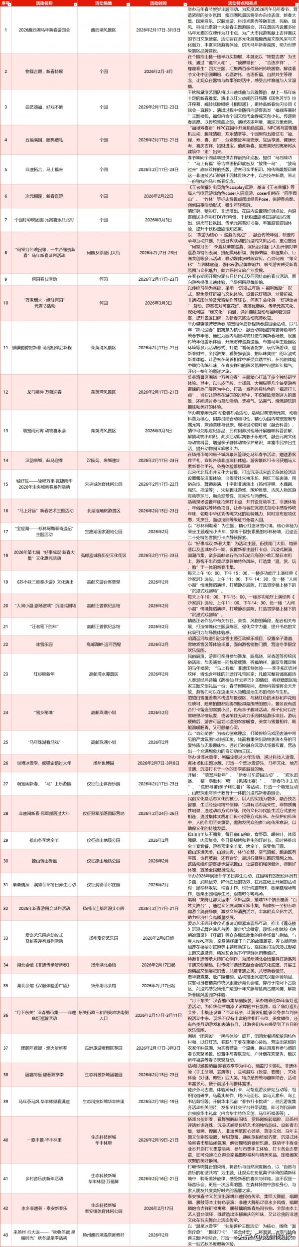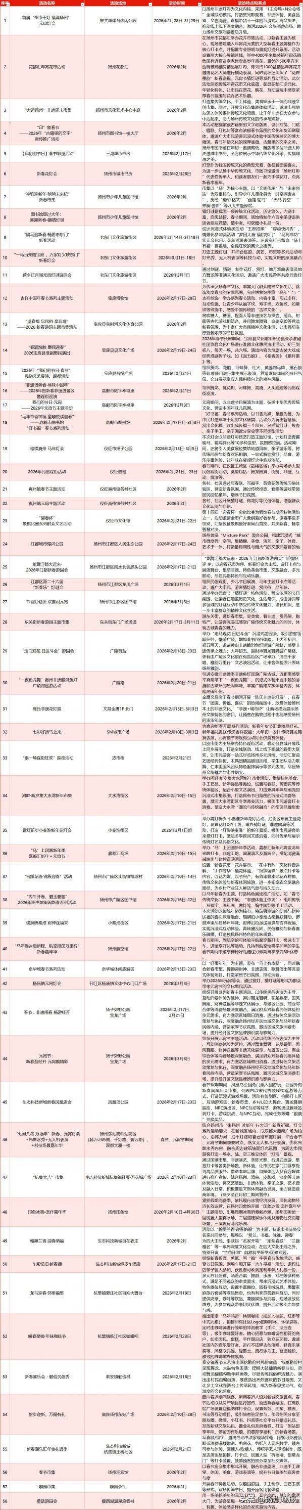 内容:持续打造“龙舞江都大运来”文旅IP,以迎春花市为序、新春灯会为主线,布设打卡点与展演舞台,集结非遗、特色美食市集,深化文旅融合、促进多元联动,尽显民俗特色与互动乐趣。