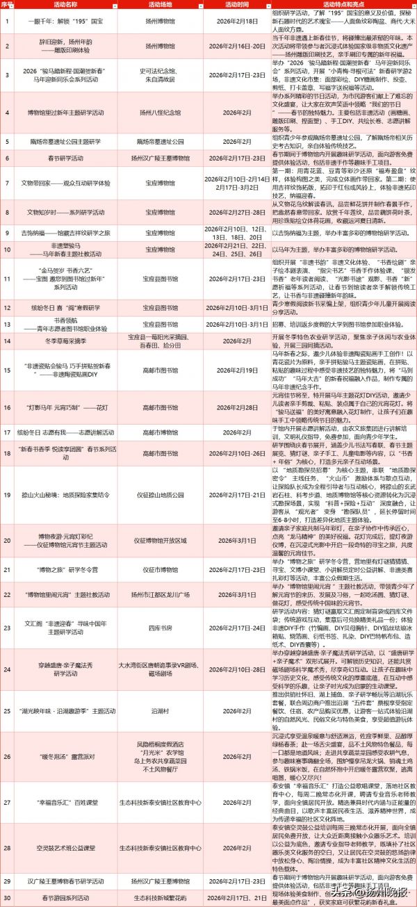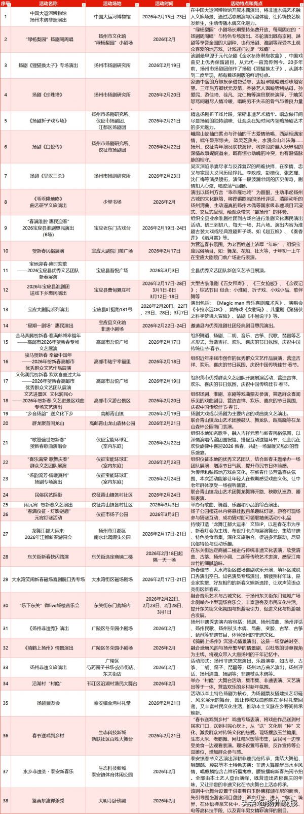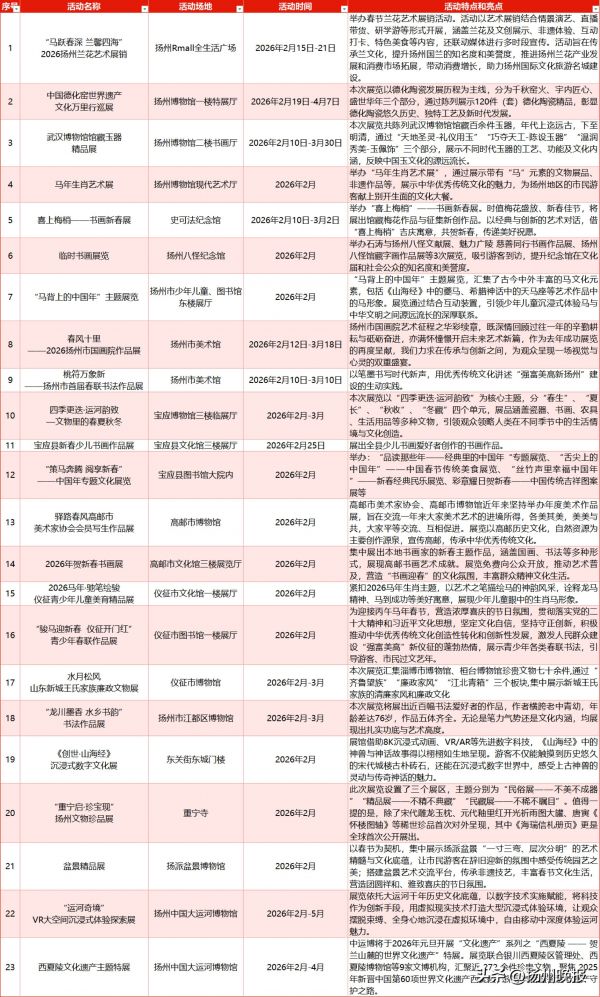 从元宵灯会到无人机光影秀,从除夕祈福到沉浸式演艺,近百项活动将轮番登场,让人们在“好地方”扬州感受浓浓的节日氛围,共度一个喜气洋洋的马年新春。