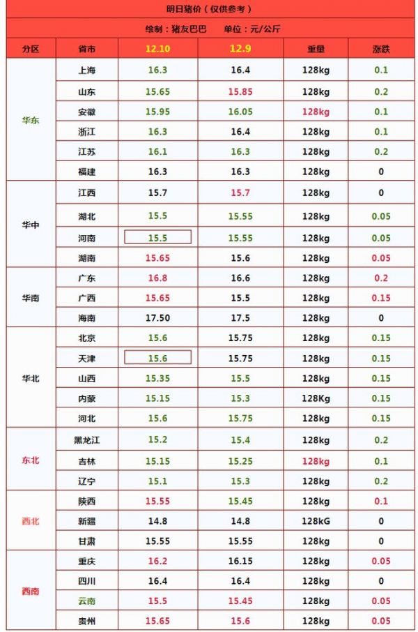 12月10日全国南北各省区生猪价格一览表: