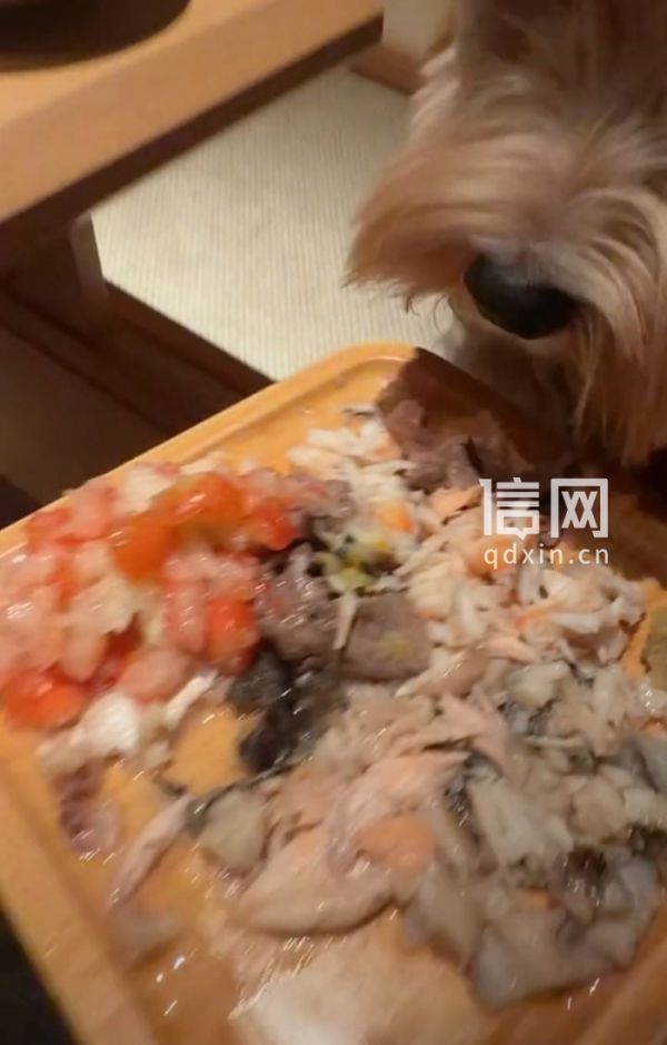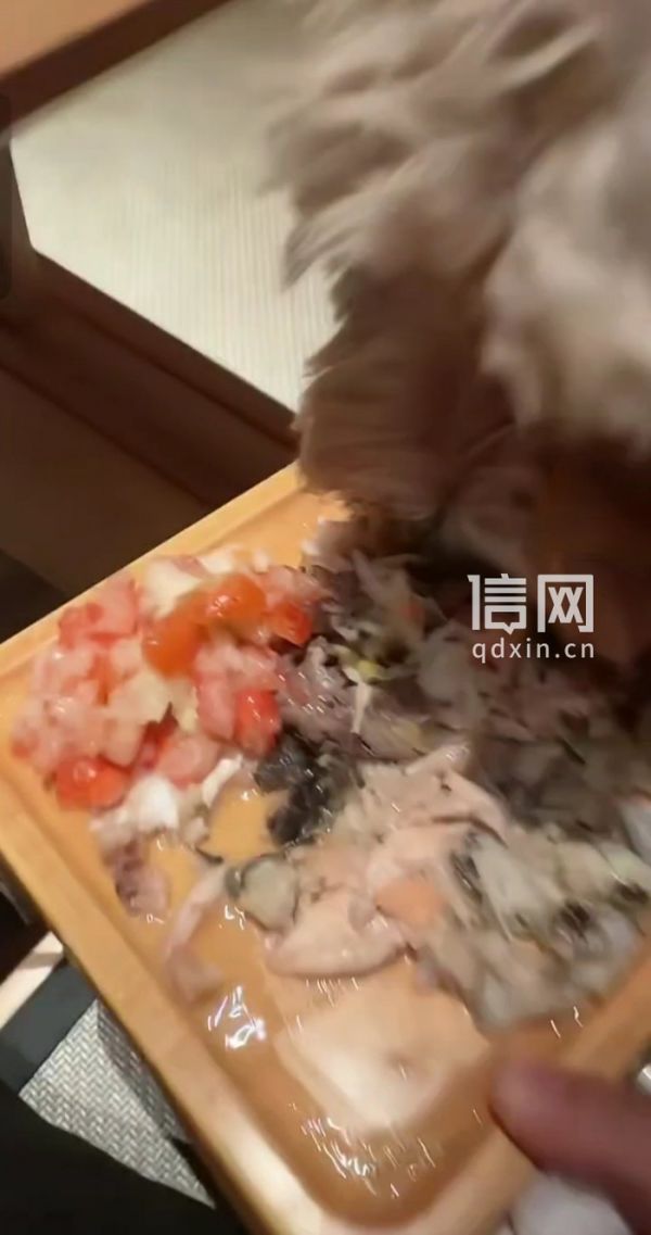 一段网络视频显示,一只棕色小型宠物狗被安置在餐厅座位上,狗主人将装有三文鱼、和牛、虾肉、草莓等食材的餐盘递到宠物狗面前,让其低头进食,并配文“由于本人实在吃不下,本着不浪费的精神,自制狗饭”。